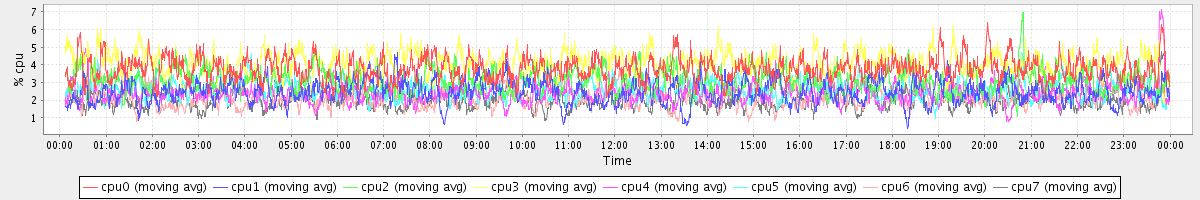 avg(cpu0) = 3.75 avg(cpu1) = 2.46 avg(cpu2) = 3.10 avg(cpu3) = 4.04 avg(cpu4) = 2.42 avg(cpu5) = 2.65 avg(cpu6) = 2.13 avg(cpu7) = 2.03