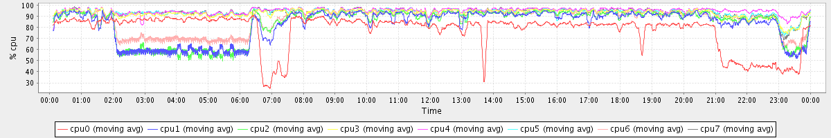 avg(cpu0) = 2.32 avg(cpu1) = 1.37 avg(cpu2) = 1.19 avg(cpu3) = 0.83 avg(cpu4) = 0.71 avg(cpu5) = 0.74 avg(cpu6) = 1.02 avg(cpu7) = 0.74