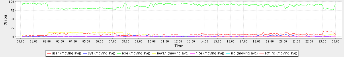 avg(user) = 6.28 avg(sys) = 1.47 avg(idle) = 88.03 avg(iowait) = 4.03 avg(nice) = 0.00 avg(irq) = 0.01 avg(softirq) = 0.16