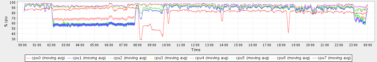 avg(cpu0) = 3.03 avg(cpu1) = 9.16 avg(cpu2) = 8.91 avg(cpu3) = 1.29 avg(cpu4) = 0.89 avg(cpu5) = 1.21 avg(cpu6) = 6.67 avg(cpu7) = 1.07
