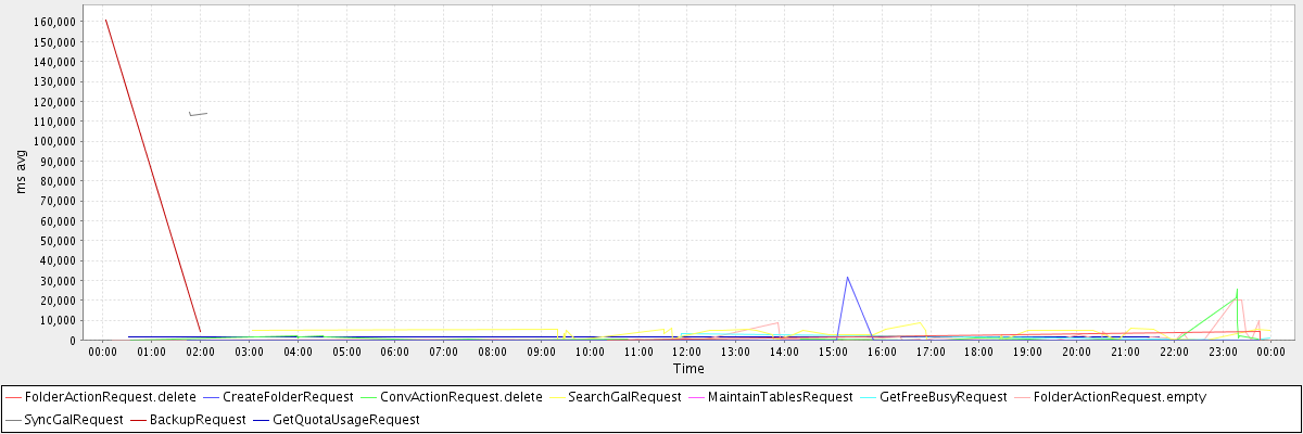 avg(FolderActionRequest.delete) = 1473.67 avg(CreateFolderRequest) = 1066.77 avg(ConvActionRequest.delete) = 1828.19 avg(SearchGalRequest) = 2696.26 avg(MaintainTablesRequest) = 132302.00 avg(GetFreeBusyRequest) = 1064.25 avg(FolderActionRequest.empty) = 1684.52 avg(SyncGalRequest) = 113623.00 avg(BackupRequest) = 82488.50 avg(GetQuotaUsageRequest) = 1314.00