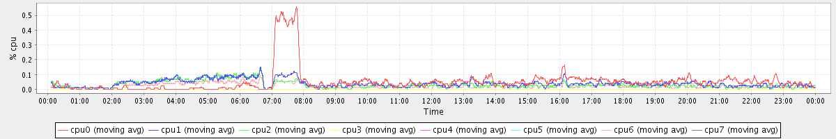 avg(cpu0) = 0.63 avg(cpu1) = 0.20 avg(cpu2) = 0.17 avg(cpu3) = 0.09 avg(cpu4) = 0.08 avg(cpu5) = 0.09 avg(cpu6) = 0.15 avg(cpu7) = 0.10