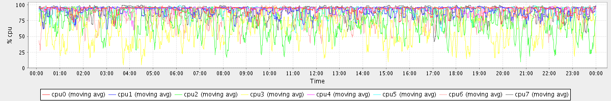 avg(cpu0) = 92.10 avg(cpu1) = 90.15 avg(cpu2) = 72.01 avg(cpu3) = 64.43 avg(cpu4) = 92.67 avg(cpu5) = 91.63 avg(cpu6) = 82.62 avg(cpu7) = 89.04