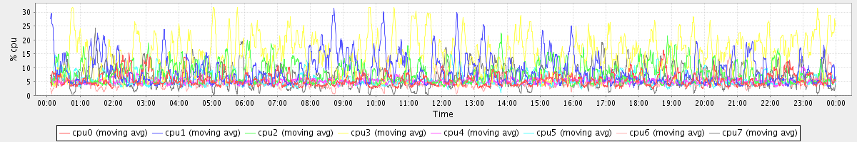 avg(cpu0) = 4.11 avg(cpu1) = 12.86 avg(cpu2) = 9.63 avg(cpu3) = 27.58 avg(cpu4) = 1.32 avg(cpu5) = 3.54 avg(cpu6) = 2.37 avg(cpu7) = 9.14