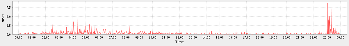 avg(ModifyContactRequest) = 21.50 avg(GetMsgRequest) = 45.21 avg(ConvActionRequest.!read) = 19.23 avg(MsgActionRequest.read) = 47.51 avg(ModifyTaskRequest) = 63.75 avg(FolderActionRequest.delete) = 25.75 avg(GetAvailableCsvFormatsRequest) = 0.06 avg(DismissCalendarItemAlarmRequest) = 26.54 avg(MsgActionRequest.move) = 51.55 avg(ModifyAppointmentRequest) = 85.19 avg(GetMiniCalRequest) = 1589.54 avg(ConvActionRequest.read) = 50.41 avg(FolderActionRequest.color) = 111.17 avg(ConvActionRequest.!flag) = 34.94 avg(FolderActionRequest.!check) = 20.67 avg(CheckLicenseRequest) = 1.24 avg(SearchConvRequest) = 63.62 avg(FolderActionRequest.read) = 16.00 avg(ModifyIdentityRequest) = 8.33 avg(CreateFolderRequest) = 20.74 avg(GetAvailableSkinsRequest) = 0.11 avg(FolderActionRequest.trash) = 39.64 avg(SendInviteReplyRequest) = 191.75 avg(SetAppointmentRequest) = 88.47 avg(GetFolderRequest) = 5.04 avg(SearchRequest) = 181.98 avg(ContactActionRequest.delete) = 75.00 avg(SendMsgRequest) = 356.74 avg(GetContactsRequest) = 34.61 avg(AutoCompleteGalRequest) = 667.59 avg(ItemActionRequest.delete) = 37.00 avg(ConvActionRequest.tag) = 40.22 avg(CreateSearchFolderRequest) = 23.50 avg(GetAvailableLocalesRequest) = 4.85 avg(SaveRulesRequest) = 12.93 avg(ImportAppointmentsRequest) = 4633.00 avg(CreateSignatureRequest) = 7.00 avg(GetAccountInfoRequest) = 0.30 avg(MsgActionRequest.delete) = 73.89 avg(ConvActionRequest.!tag) = 25.00 avg(CreateTaskRequest) = 48.25 avg(ConvActionRequest.delete) = 128.50 avg(NoOpRequest) = 0.00 avg(SearchGalRequest) = 3424.82 avg(SyncRequest) = 0.42 avg(BackupQueryRequest) = 809.50 avg(ConvActionRequest.move) = 36.21 avg(ModifyPrefsRequest) = 10.85 avg(ItemActionRequest.tag) = 11.33 avg(MaintainTablesRequest) = 370303.00 avg(GetInfoRequest) = 15.40 avg(MsgActionRequest.trash) = 23.54 avg(ConvActionRequest.trash) = 39.79 avg(MsgActionRequest.!read) = 18.10 avg(GetFreeBusyRequest) = 1203.79 avg(MsgActionRequest.!flag) = 13.00 avg(CreateWaitSetRequest) = 0.00 avg(GetRulesRequest) = 0.33 avg(EndSessionRequest) = 6.04 avg(FolderActionRequest.move) = 19.43 avg(FolderActionRequest.empty) = 1515.39 avg(BrowseRequest) = 1.00 avg(CancelTaskRequest) = 272.00 avg(CreateTagRequest) = 26.75 avg(DelegateAuthRequest) = 0.28 avg(SyncGalRequest) = 121776.67 avg(AuthRequest) = 1.46 avg(MsgActionRequest.update) = 38.84 avg(CreateAppointmentExceptionRequest) = 179.00 avg(ConvActionRequest.spam) = 25.29 avg(GetTaskRequest) = 1.00 avg(GetAppointmentRequest) = 13.33 avg(BackupRequest) = 1982.00 avg(WaitSetRequest) = 4.52 avg(SaveDraftRequest) = 172.65 avg(ContactActionRequest.move) = 31.00 avg(ConvActionRequest.flag) = 29.91 avg(GetPermissionRequest) = 0.00 avg(CreateAppointmentRequest) = 59.38 avg(CheckSpellingRequest) = 66.21 avg(CancelAppointmentRequest) = 106.00 avg(SearchCalendarResourcesRequest) = 9.32 avg(MsgActionRequest.flag) = 15.05 avg(FolderActionRequest.check) = 14.00 avg(CreateContactRequest) = 43.50 avg(GetQuotaUsageRequest) = 1327.50 avg(FolderActionRequest.rename) = 14.00 avg(AddMsgRequest) = 58.50 avg(MsgActionRequest.spam) = 34.59 avg(GetDomainInfoRequest) = 1.59