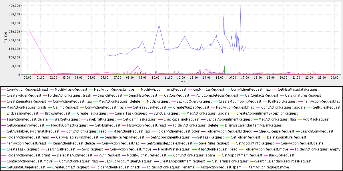 avg(ConvActionRequest.!read) = 34.79 avg(ModifyTaskRequest) = 154.00 avg(MsgActionRequest.move) = 23.98 avg(ModifyAppointmentRequest) = 243.37 avg(GetMiniCalRequest) = 2772.92 avg(ConvActionRequest.!flag) = 23.58 avg(GetMsgMetadataRequest) = 1.00 avg(CreateFolderRequest) = 18.40 avg(FolderActionRequest.trash) = 20.54 avg(SearchRequest) = 221.58 avg(SendMsgRequest) = 338.12 avg(GetCosRequest) = 0.00 avg(AutoCompleteGalRequest) = 1505.22 avg(GetContactsRequest) = 36.76 avg(GetSignaturesRequest) = 0.50 avg(CreateSignatureRequest) = 5.67 avg(ConvActionRequest.!tag) = 22.50 avg(MsgActionRequest.delete) = 22.43 avg(NoOpRequest) = 0.00 avg(BackupQueryRequest) = 571.60 avg(CreateMountpointRequest) = 31.54 avg(ICalReplyRequest) = 346.26 avg(ItemActionRequest.tag) = 12.75 avg(MsgActionRequest.trash) = 29.25 avg(GetInfoRequest) = 14.83 avg(ConvActionRequest.trash) = 40.17 avg(GetFreeBusyRequest) = 3675.10 avg(CreateWaitSetRequest) = 0.33 avg(MsgActionRequest.!flag) = 17.23 avg(ConvActionRequest.update) = 32.00 avg(GetRulesRequest) = 0.36 avg(EndSessionRequest) = 11.09 avg(BrowseRequest) = 336.50 avg(CreateTagRequest) = 15.78 avg(CancelTaskRequest) = 90.33 avg(SyncGalRequest) = 172184.02 avg(MsgActionRequest.update) = 23.70 avg(CreateAppointmentExceptionRequest) = 4136.29 avg(TagActionRequest.delete) = 19.00 avg(WaitSetRequest) = 12.62 avg(SaveDraftRequest) = 194.30 avg(GetIdentitiesRequest) = 1.00 avg(CheckSpellingRequest) = 79.83 avg(CancelAppointmentRequest) = 343.49 avg(MsgActionRequest.flag) = 16.21 avg(AddMsgRequest) = 106.16 avg(GetDomainInfoRequest) = 1.71 avg(ModifyContactRequest) = 56.56 avg(GetMsgRequest) = 42.79 avg(MsgActionRequest.read) = 66.71 avg(FolderActionRequest.delete) = 23.83 avg(DismissCalendarItemAlarmRequest) = 27.54 avg(GetAvailableCsvFormatsRequest) = 0.06 avg(ConvActionRequest.read) = 15.19 avg(MsgActionRequest.tag) = 19.67 avg(FolderActionRequest.color) = 88.75 avg(FolderActionRequest.!check) = 128.57 avg(CheckLicenseRequest) = 1.09 avg(SearchConvRequest) = 64.41 avg(FolderActionRequest.read) = 33.22 avg(GetAvailableSkinsRequest) = 0.13 avg(SendInviteReplyRequest) = 528.57 avg(SetAppointmentRequest) = 101.14 avg(SetTaskRequest) = 48.86 avg(GetFolderRequest) = 7.23 avg(DeleteSignatureRequest) = 5.50 avg(ItemActionRequest.read) = 19.00 avg(ItemActionRequest.delete) = 37.67 avg(ConvActionRequest.tag) = 14.08 avg(GetAvailableLocalesRequest) = 5.06 avg(SaveRulesRequest) = 11.23 avg(GetAccountInfoRequest) = 0.48 avg(ConvActionRequest.delete) = 311.29 avg(CreateTaskRequest) = 2136.50 avg(SearchGalRequest) = 3913.19 avg(SyncRequest) = 1.83 avg(ConvActionRequest.move) = 26.00 avg(ModifyPrefsRequest) = 7.82 avg(MsgActionRequest.!read) = 17.85 avg(FolderActionRequest.move) = 20.33 avg(FolderActionRequest.empty) = 2271.12 avg(FolderActionRequest.grant) = 37.00 avg(DelegateAuthRequest) = 0.33 avg(AuthRequest) = 3.66 avg(ModifySignatureRequest) = 8.67 avg(ConvActionRequest.spam) = 39.90 avg(GetAppointmentRequest) = 66.59 avg(BackupRequest) = 131994.50 avg(ContactActionRequest.move) = 27.67 avg(ConvActionRequest.flag) = 23.61 avg(BackupAccountQueryRequest) = 710.00 avg(CreateAppointmentRequest) = 117.33 avg(GetPermissionRequest) = 0.00 avg(SearchCalendarResourcesRequest) = 5.01 avg(GetQuotaUsageRequest) = 1349.00 avg(CreateContactRequest) = 50.28 avg(FolderActionRequest.check) = 746.46 avg(FolderActionRequest.rename) = 20.29 avg(MsgActionRequest.spam) = 22.29 avg(ItemActionRequest.move) = 19.14
