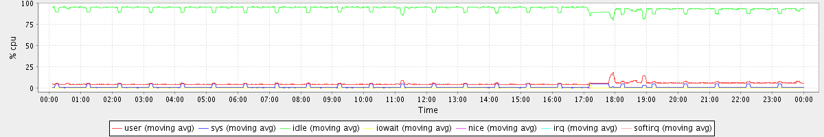 avg(user) = 4.94 avg(sys) = 1.05 avg(idle) = 93.96 avg(iowait) = 0.02 avg(nice) = 0.00 avg(irq) = 0.00 avg(softirq) = 0.00