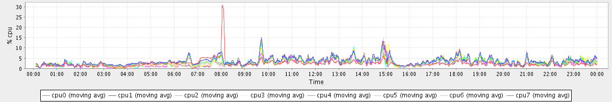avg(cpu0) = 21.65 avg(cpu1) = 14.07 avg(cpu2) = 12.55 avg(cpu3) = 11.84 avg(cpu4) = 9.11 avg(cpu5) = 11.14 avg(cpu6) = 12.58 avg(cpu7) = 12.21