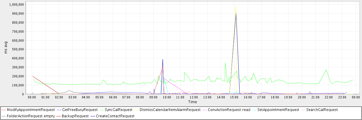 avg(ModifyAppointmentRequest) = 4585.43 avg(GetFreeBusyRequest) = 4120.02 avg(SyncGalRequest) = 142969.39 avg(DismissCalendarItemAlarmRequest) = 9718.62 avg(ConvActionRequest.read) = 14006.85 avg(SetAppointmentRequest) = 5772.40 avg(SearchGalRequest) = 5220.20 avg(FolderActionRequest.empty) = 2953.15 avg(BackupRequest) = 100380.50 avg(CreateContactRequest) = 21676.63