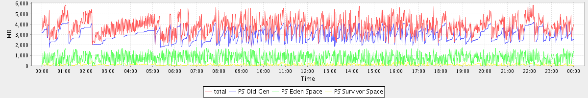 avg(total) = 3817.85 avg(PS Old Gen) = 2948.33 avg(PS Eden Space) = 754.91 avg(PS Survivor Space) = 114.61