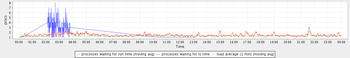 avg(processes waiting for run time) = 1.44 avg(processes waiting for io time) = 0.19 avg(load average (1 min)) = 1.47