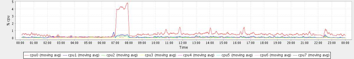 avg(cpu0) = 0.60 avg(cpu1) = 0.12 avg(cpu2) = 0.10 avg(cpu3) = 0.02 avg(cpu4) = 0.01 avg(cpu5) = 0.02 avg(cpu6) = 0.08 avg(cpu7) = 0.02