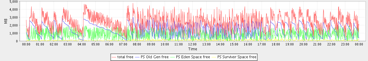 avg(total free) = 2402.18 avg(PS Old Gen free) = 1429.67 avg(PS Eden Space free) = 865.82 avg(PS Survivor Space free) = 106.69