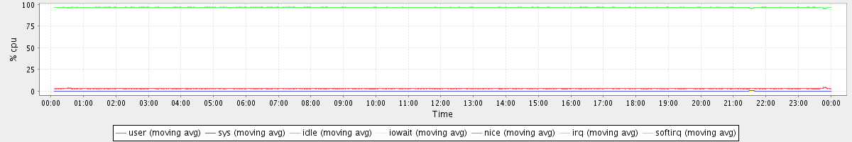 avg(user) = 2.95 avg(sys) = 0.19 avg(idle) = 96.81 avg(iowait) = 0.03 avg(nice) = 0.00 avg(irq) = 0.00 avg(softirq) = 0.00