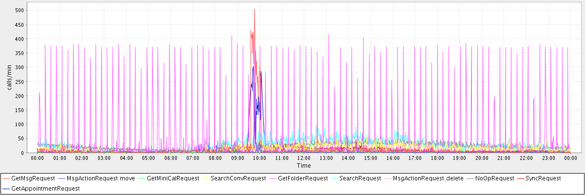 max(GetMsgRequest) = 504.00 max(MsgActionRequest.move) = 57.00 max(GetMiniCalRequest) = 45.00 max(SearchConvRequest) = 58.00 max(GetFolderRequest) = 414.00 max(SearchRequest) = 92.00 max(MsgActionRequest.delete) = 113.00 max(NoOpRequest) = 49.00 max(SyncRequest) = 41.00 max(GetAppointmentRequest) = 303.00