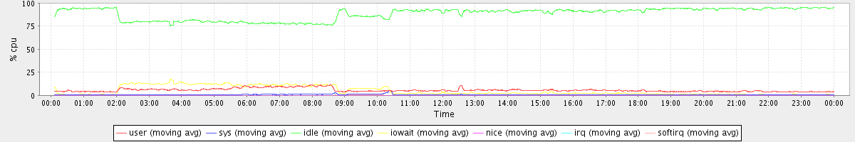avg(user) = 5.67 avg(sys) = 0.73 avg(idle) = 88.53 avg(iowait) = 4.93 avg(nice) = 0.00 avg(irq) = 0.01 avg(softirq) = 0.14
