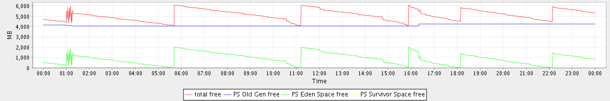 avg(total free) = 5110.69 avg(PS Old Gen free) = 4130.57 avg(PS Eden Space free) = 883.91 avg(PS Survivor Space free) = 96.21