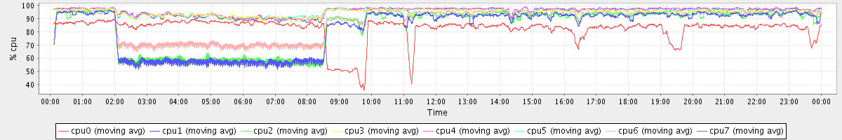 avg(cpu0) = 1.23 avg(cpu1) = 1.14 avg(cpu2) = 1.01 avg(cpu3) = 0.52 avg(cpu4) = 0.39 avg(cpu5) = 0.40 avg(cpu6) = 0.76 avg(cpu7) = 0.38