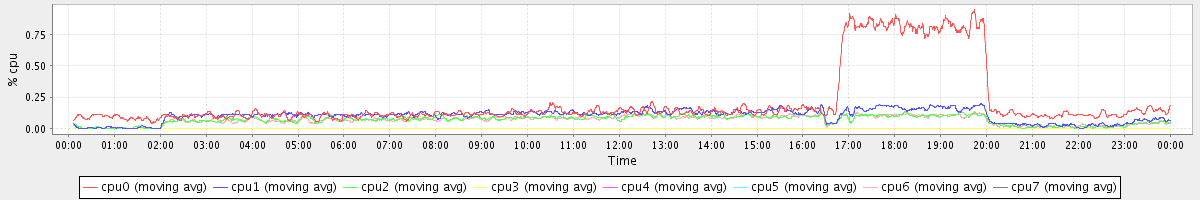 avg(cpu0) = 2.13 avg(cpu1) = 0.41 avg(cpu2) = 0.44 avg(cpu3) = 0.36 avg(cpu4) = 0.19 avg(cpu5) = 0.20 avg(cpu6) = 0.30 avg(cpu7) = 0.21