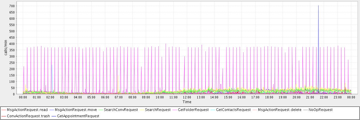 max(MsgActionRequest.read) = 49.00 max(MsgActionRequest.move) = 702.00 max(SearchConvRequest) = 59.00 max(SearchRequest) = 147.00 max(GetFolderRequest) = 399.00 max(GetContactsRequest) = 231.00 max(MsgActionRequest.delete) = 29.00 max(NoOpRequest) = 43.00 max(ConvActionRequest.trash) = 44.00 max(GetAppointmentRequest) = 34.00