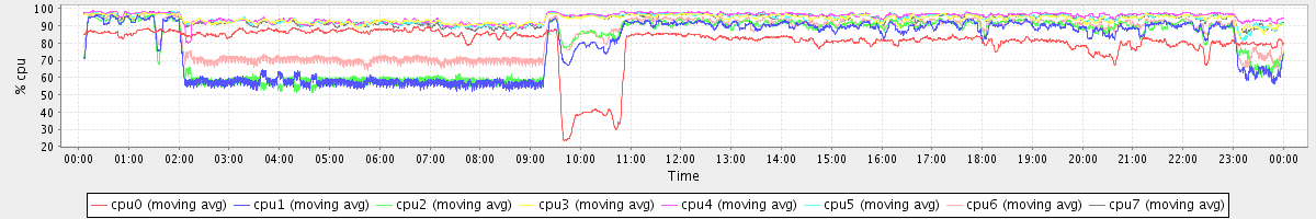 avg(cpu0) = 3.70 avg(cpu1) = 12.03 avg(cpu2) = 11.42 avg(cpu3) = 1.48 avg(cpu4) = 1.60 avg(cpu5) = 1.85 avg(cpu6) = 8.30 avg(cpu7) = 1.86