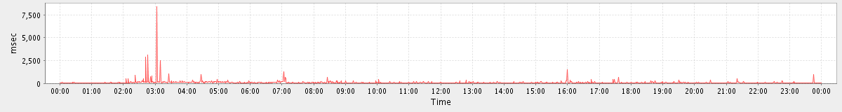 avg(GetMiniCalRequest) = 637.85 avg(SendMsgRequest) = 765.54 avg(AutoCompleteGalRequest) = 1582.93 avg(SearchGalRequest) = 6728.33 avg(BackupQueryRequest) = 707.60 avg(GetFreeBusyRequest) = 1712.39 avg(FolderActionRequest.empty) = 5913.59 avg(SyncGalRequest) = 241486.70 avg(BackupRequest) = 285855.50 avg(GetQuotaUsageRequest) = 1297.50