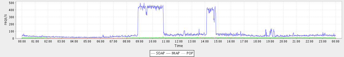 Host zm01.stanford.edu: Mailboxd: Request Rate by Client Protocol