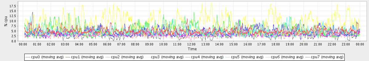 avg(cpu0) = 4.54 avg(cpu1) = 7.52 avg(cpu2) = 13.72 avg(cpu3) = 28.65 avg(cpu4) = 3.03 avg(cpu5) = 7.90 avg(cpu6) = 6.50 avg(cpu7) = 7.54