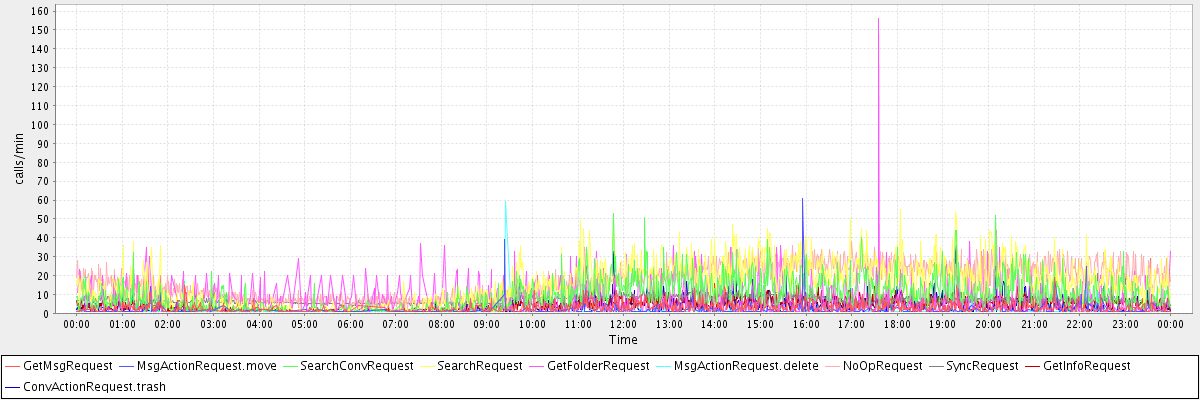 max(GetMsgRequest) = 19.00 max(MsgActionRequest.move) = 61.00 max(SearchConvRequest) = 53.00 max(SearchRequest) = 55.00 max(GetFolderRequest) = 156.00 max(MsgActionRequest.delete) = 59.00 max(NoOpRequest) = 38.00 max(SyncRequest) = 26.00 max(GetInfoRequest) = 16.00 max(ConvActionRequest.trash) = 36.00