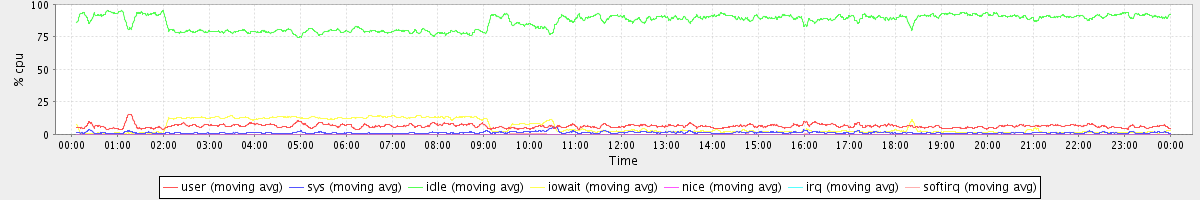avg(user) = 6.39 avg(sys) = 1.25 avg(idle) = 86.68 avg(iowait) = 5.55 avg(nice) = 0.00 avg(irq) = 0.00 avg(softirq) = 0.13