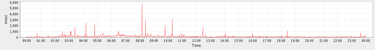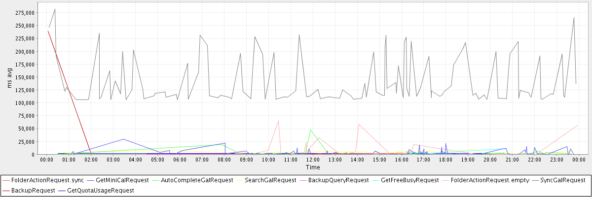 avg(FolderActionRequest.sync) = 1257.33 avg(GetMiniCalRequest) = 2789.57 avg(AutoCompleteGalRequest) = 2774.59 avg(SearchGalRequest) = 4280.50 avg(BackupQueryRequest) = 752.09 avg(GetFreeBusyRequest) = 5112.50 avg(FolderActionRequest.empty) = 12119.46 avg(SyncGalRequest) = 141021.01 avg(BackupRequest) = 120593.50 avg(GetQuotaUsageRequest) = 1808.00