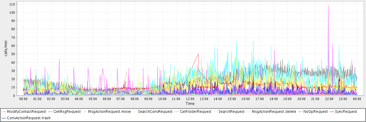 max(ModifyContactRequest) = 50.00 max(GetMsgRequest) = 39.00 max(MsgActionRequest.move) = 24.00 max(SearchConvRequest) = 52.00 max(GetFolderRequest) = 108.00 max(SearchRequest) = 65.00 max(MsgActionRequest.delete) = 29.00 max(NoOpRequest) = 44.00 max(SyncRequest) = 35.00 max(ConvActionRequest.trash) = 33.00