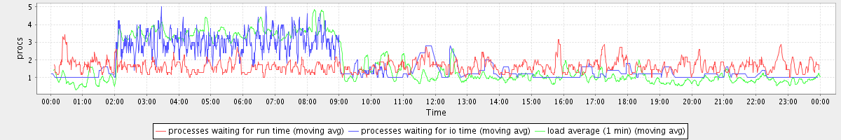 avg(processes waiting for run time) = 0.84 avg(processes waiting for io time) = 0.96 avg(load average (1 min)) = 1.76
