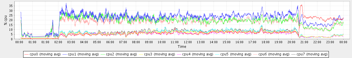 avg(cpu0) = 19.74 avg(cpu1) = 18.05 avg(cpu2) = 15.47 avg(cpu3) = 7.54 avg(cpu4) = 6.01 avg(cpu5) = 6.70 avg(cpu6) = 14.09 avg(cpu7) = 8.46