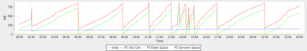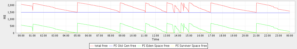 avg(total free) = 1847.57 avg(PS Old Gen free) = 1468.55 avg(PS Eden Space free) = 365.58 avg(PS Survivor Space free) = 13.44
