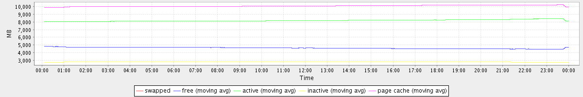 avg(swapped) = 0.00 avg(free) = 4594.95 avg(active) = 8200.01 avg(inactive) = 2803.00 avg(page cache) = 10104.28
