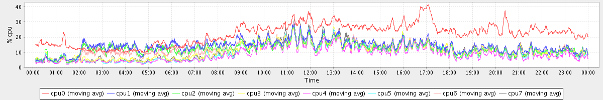 avg(cpu0) = 21.92 avg(cpu1) = 13.74 avg(cpu2) = 12.27 avg(cpu3) = 10.74 avg(cpu4) = 8.57 avg(cpu5) = 10.12 avg(cpu6) = 12.08 avg(cpu7) = 10.84