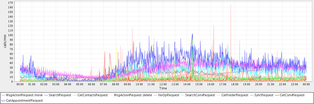 max(MsgActionRequest.move) = 64.00 max(SearchRequest) = 98.00 max(GetContactsRequest) = 89.00 max(MsgActionRequest.delete) = 73.00 max(NoOpRequest) = 58.00 max(SearchConvRequest) = 87.00 max(GetFolderRequest) = 165.00 max(SyncRequest) = 36.00 max(GetConvRequest) = 38.00 max(GetAppointmentRequest) = 103.00