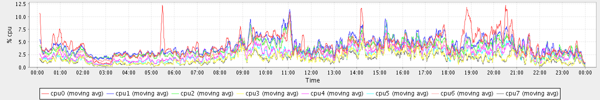 avg(cpu0) = 7.60 avg(cpu1) = 22.34 avg(cpu2) = 18.19 avg(cpu3) = 2.54 avg(cpu4) = 4.63 avg(cpu5) = 5.03 avg(cpu6) = 17.20 avg(cpu7) = 2.83