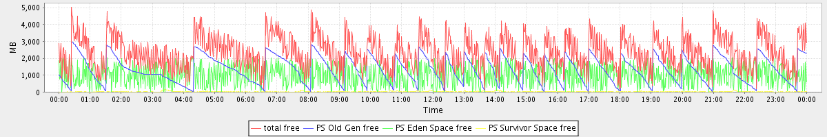 avg(total free) = 2370.56 avg(PS Old Gen free) = 1324.11 avg(PS Eden Space free) = 1023.57 avg(PS Survivor Space free) = 22.89