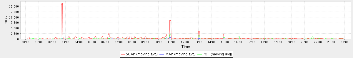 avg(FolderActionRequest.sync) = 2891.00 avg(ModifyAppointmentRequest) = 7711.61 avg(ImportAppointmentsRequest) = 5453.00 avg(SyncGalRequest) = 130628.50 avg(AddMsgRequest) = 4688.51 avg(SearchGalRequest) = 8210.43 avg(ConvActionRequest.spam) = 3256.11 avg(BackupRequest) = 332942.00 avg(CreateAppointmentRequest) = 7238.87 avg(FolderActionRequest.check) = 11104.32