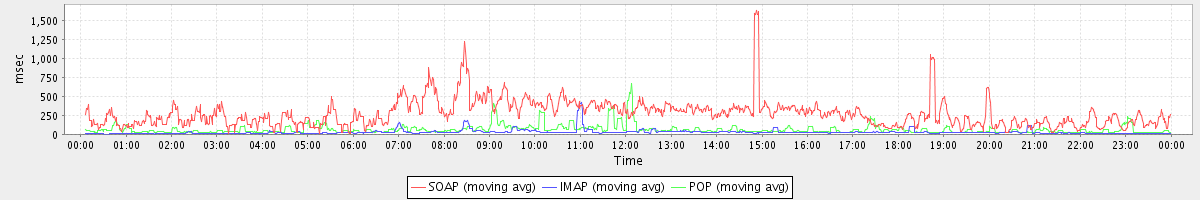 avg(FolderActionRequest.sync) = 2521.00 avg(GetMiniCalRequest) = 4706.09 avg(AutoCompleteGalRequest) = 1202.28 avg(SearchGalRequest) = 7456.62 avg(GetFreeBusyRequest) = 8368.79 avg(FolderActionRequest.empty) = 5213.84 avg(SyncGalRequest) = 161990.05 avg(BackupRequest) = 126685.00 avg(FolderActionRequest.check) = 970.94 avg(GetQuotaUsageRequest) = 2237.00