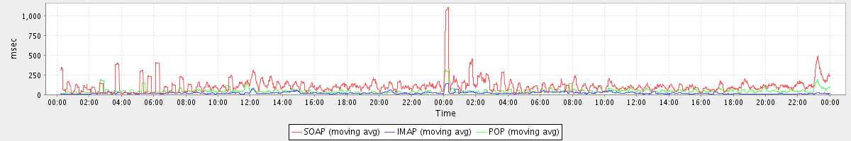 max(GetMsgRequest) = 140.00 max(SearchConvRequest) = 81.00 max(SearchRequest) = 81.00 max(GetFolderRequest) = 480.00 max(SaveRulesRequest) = 83.00 max(MsgActionRequest.delete) = 221.00 max(NoOpRequest) = 49.00 max(GetInfoRequest) = 41.00 max(ConvActionRequest.trash) = 58.00 max(GetAppointmentRequest) = 136.00
