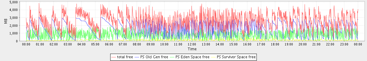avg(total free) = 2554.99 avg(PS Old Gen free) = 1604.37 avg(PS Eden Space free) = 826.75 avg(PS Survivor Space free) = 123.87