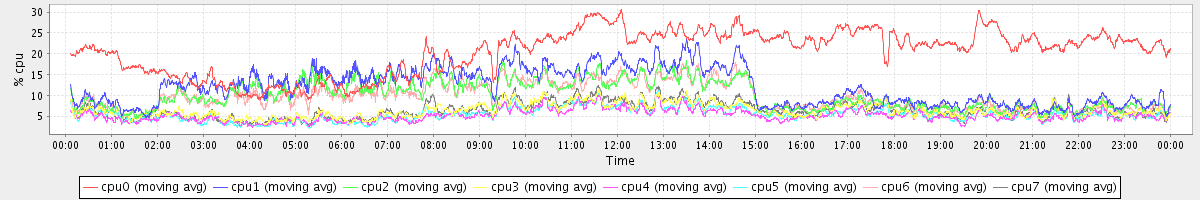 avg(cpu0) = 20.50 avg(cpu1) = 11.98 avg(cpu2) = 10.06 avg(cpu3) = 6.35 avg(cpu4) = 5.16 avg(cpu5) = 5.42 avg(cpu6) = 9.70 avg(cpu7) = 6.37