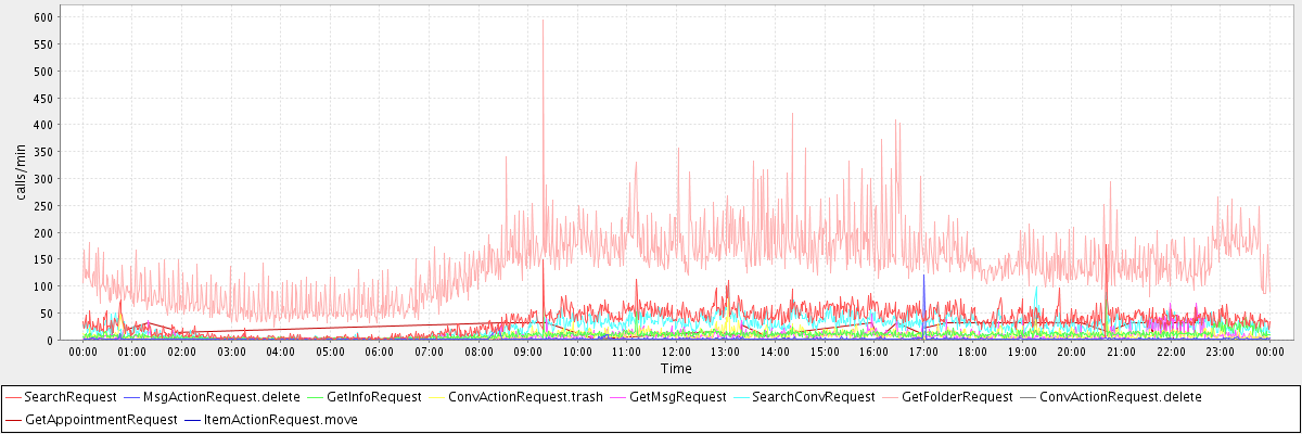 max(SearchRequest) = 178.00 max(MsgActionRequest.delete) = 120.00 max(GetInfoRequest) = 75.00 max(ConvActionRequest.trash) = 79.00 max(GetMsgRequest) = 69.00 max(SearchConvRequest) = 102.00 max(GetFolderRequest) = 594.00 max(ConvActionRequest.delete) = 57.00 max(GetAppointmentRequest) = 64.00 max(ItemActionRequest.move) = 154.00