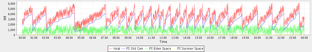 avg(total) = 3569.76 avg(PS Old Gen) = 2586.74 avg(PS Eden Space) = 937.29 avg(PS Survivor Space) = 45.73