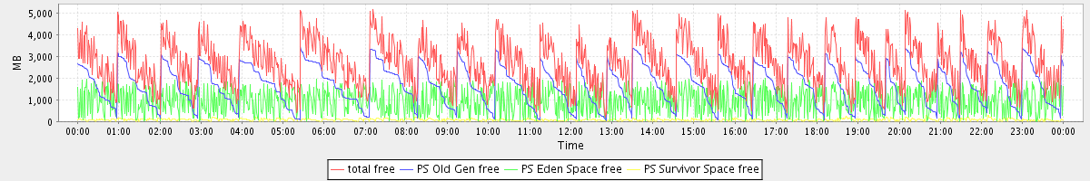 avg(total free) = 2711.51 avg(PS Old Gen free) = 1667.41 avg(PS Eden Space free) = 959.75 avg(PS Survivor Space free) = 84.35