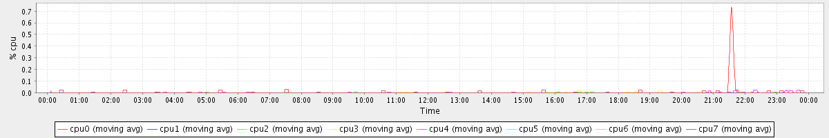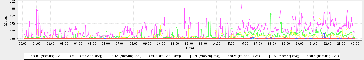avg(cpu0) = 0.38 avg(cpu1) = 0.26 avg(cpu2) = 0.21 avg(cpu3) = 0.26 avg(cpu4) = 0.21 avg(cpu5) = 0.12 avg(cpu6) = 0.11 avg(cpu7) = 0.10