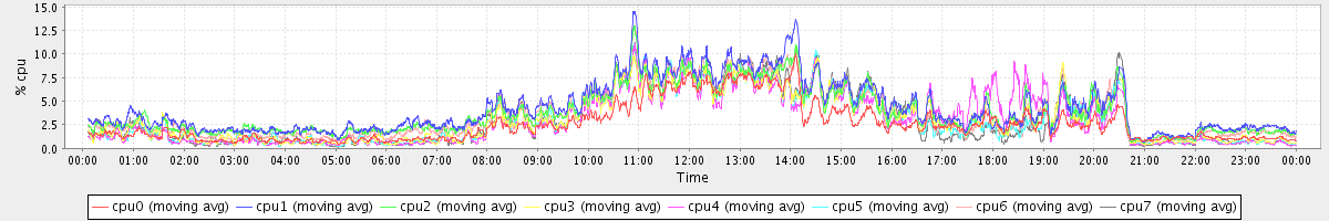 avg(cpu0) = 7.43 avg(cpu1) = 25.51 avg(cpu2) = 22.13 avg(cpu3) = 3.80 avg(cpu4) = 3.21 avg(cpu5) = 4.26 avg(cpu6) = 18.94 avg(cpu7) = 3.33